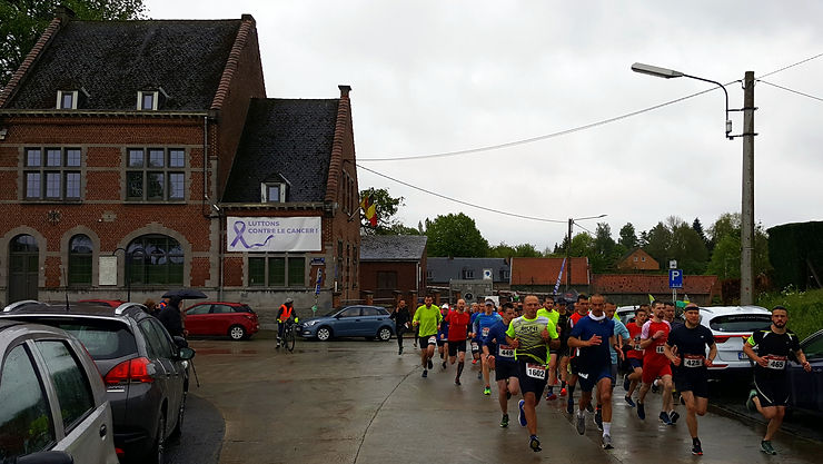 En avril, ne te découvre pas d’un fil ! 6°, fine pluie. Pas de vent, heureusement ! Quelques-uns ont peut-être hésité à se mettre en route, voire pensé aux coureurs de Liège-Bastogne-Liège qui devraient, le même jour, se farcir ces conditions sur un parcours de 256 km truffé de côtes ardennaises ! Résultat : 120 coureurs sur la longue, 72 sur la courte, quelques marcheurs : pas la foule mais la course était coincée entre trail gourmand d’Élouges (la veille) et Grand Prix des Sylves (trois jours plus tard).
